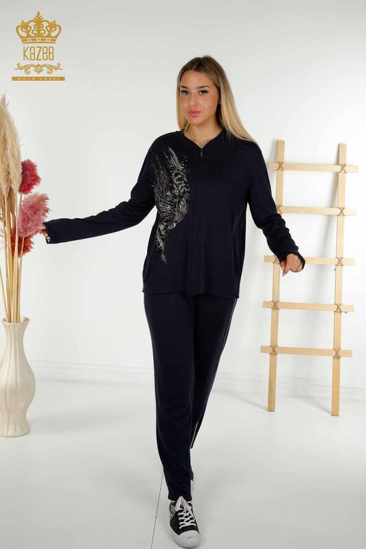 Set de trening cu ridicata pentru femei, cu model leopard, cu fermoar, brodat cu piatra, bleumarin - 16660 | KAZEE