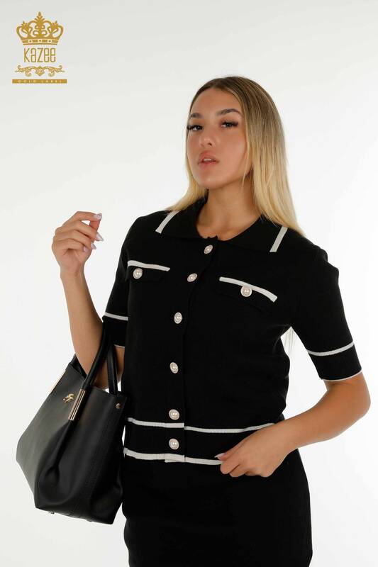 Costum cu ridicata din două piese pentru femei cu detaliu de nasturi și buzunar negru Ecru - 30303 | KAZEE