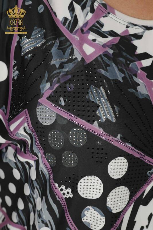 Bluză cu ridicata pentru femei cu imprimeu digital cu mâneci scurte brodate cu piatră roz - 12052 | KAZEE
