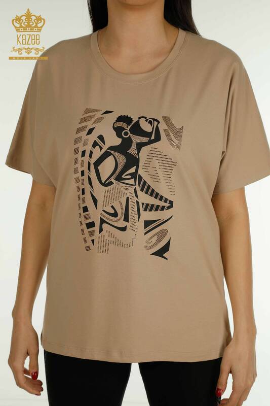 Bluză de damă cu ridicata, cu modele, brodate cu piatră, cu gât roșu, bej - 79861 | KAZEE