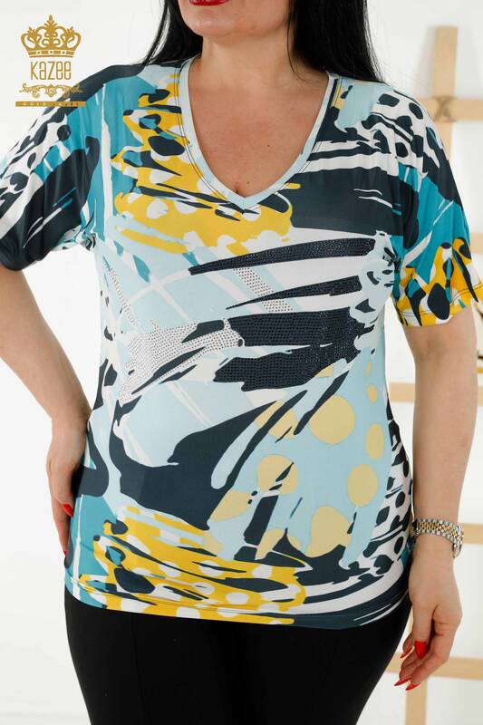 Bluză de damă cu ridicata cu imprimeu digital cu piatră brodata mentă - 77899 | KAZEE
