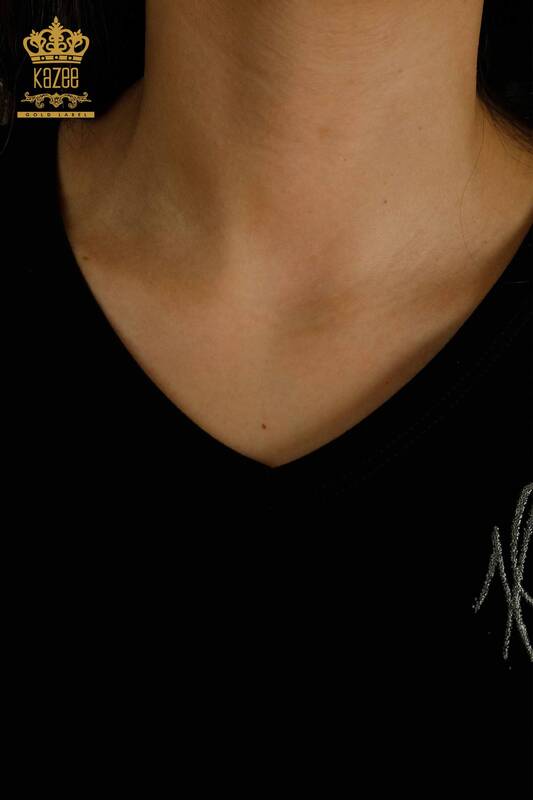 Bluză de damă cu ridicata cu mâneci scurte brodate cu trandafiri, brodate cu piatră, neagră - 79867 | KAZEE