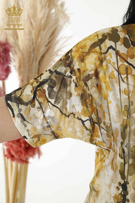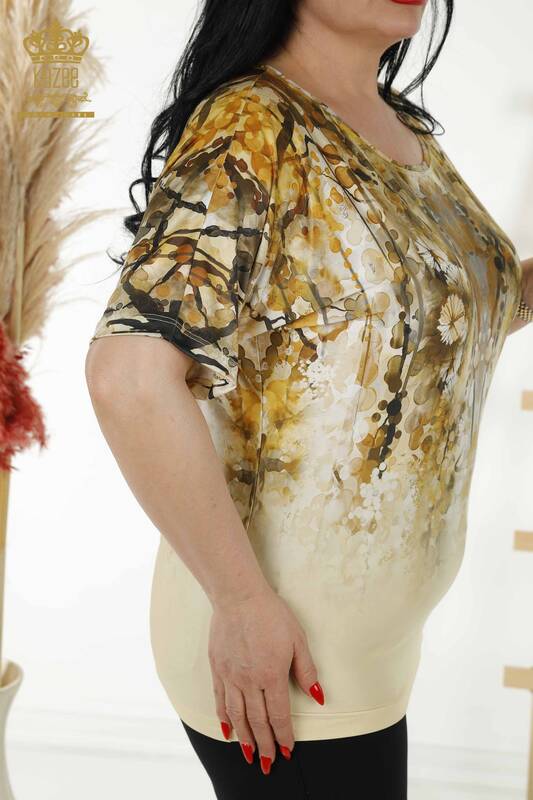 Bluză cu ridicata pentru femei, imprimare digitală, cu mâneci scurte brodate cu piatră, șofran - 77894 | KAZEE