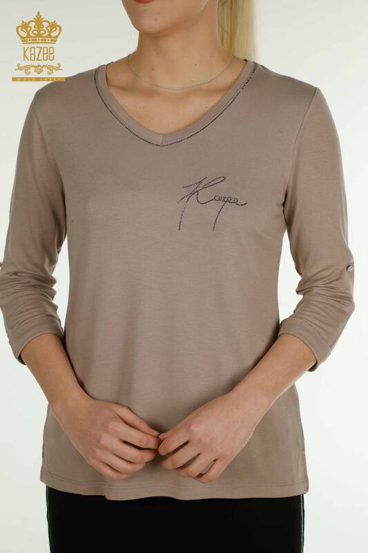 Bluză de damă cu ridicata, cu decolteu în V, din nurcă brodată cu piatră - 79309 | KAZEE