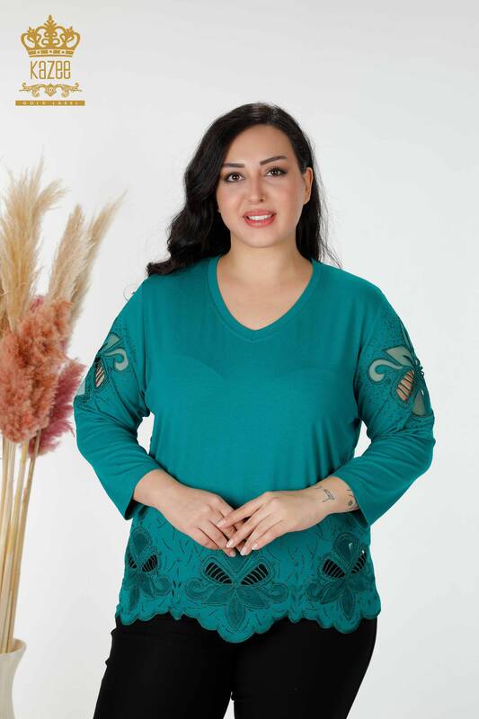Bluză de damă cu ridicata cu tul brodat cu piatră, cu decolteu în V, verde - 77927 | KAZEE