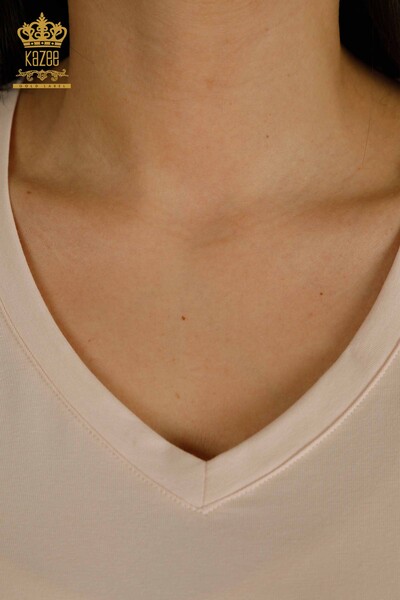 Bluză de damă cu ridicata cu mânecă scurtă, cu decolteu în V, brodat cu piatră, pudră ușoară - 79561 | KAZEE