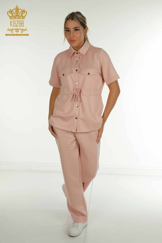 Comerț cu ridicata pentru femei triplu trening Set buton buzunar detaliat maneci scurte pulbere - 17633 | KAZEE