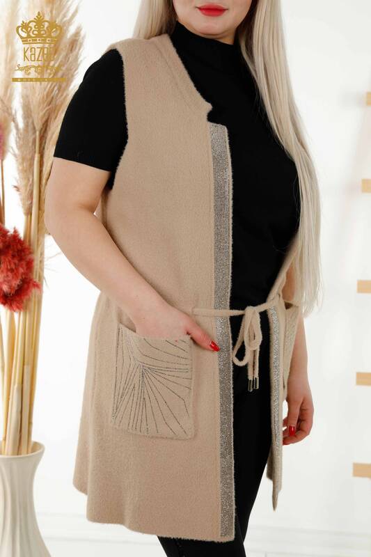 Vesta cu ridicata pentru femei, cu piatra brodata cu cordon, buzunar bej - 30244 | KAZEE