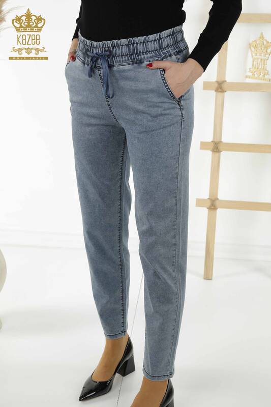 Pantaloni de damă cu ridicata cu talie elastică brodate cu piatră Bleumarin - 3674 | KAZEE