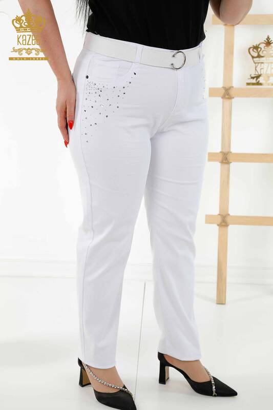 Pantaloni en-gros de damă cu curea, buzunar brodat cu piatră detaliat alb - 3689 | KAZEE