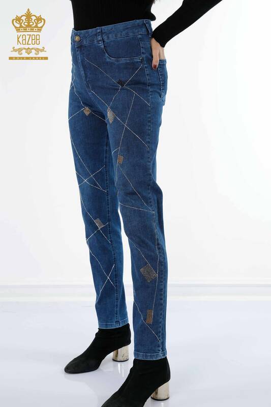 Blugi de damă cu ridicata cu detaliu dungi și piatră de cristal - 3551 | KAZEE
