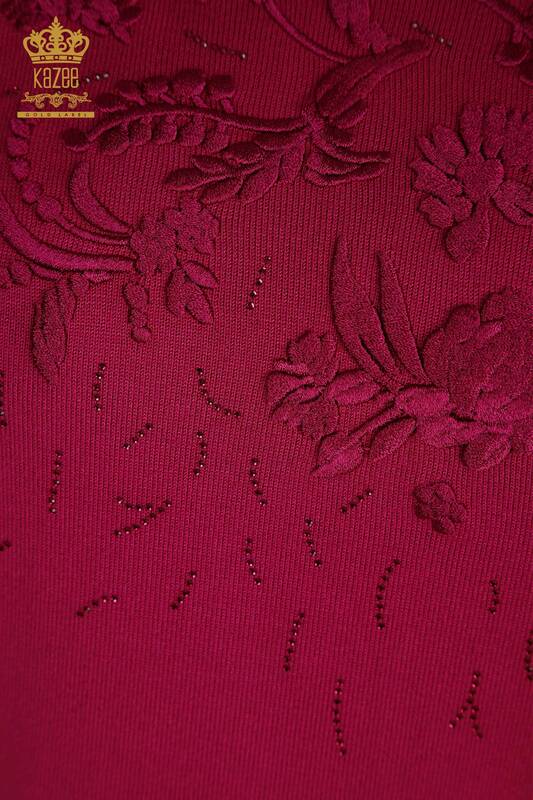 Hurtownia Dzianiny Damskiej Wzorzyste Kwiatowe Kamienie Haftowane Długim Rękawem Fuksja - 16849 | KAZEE