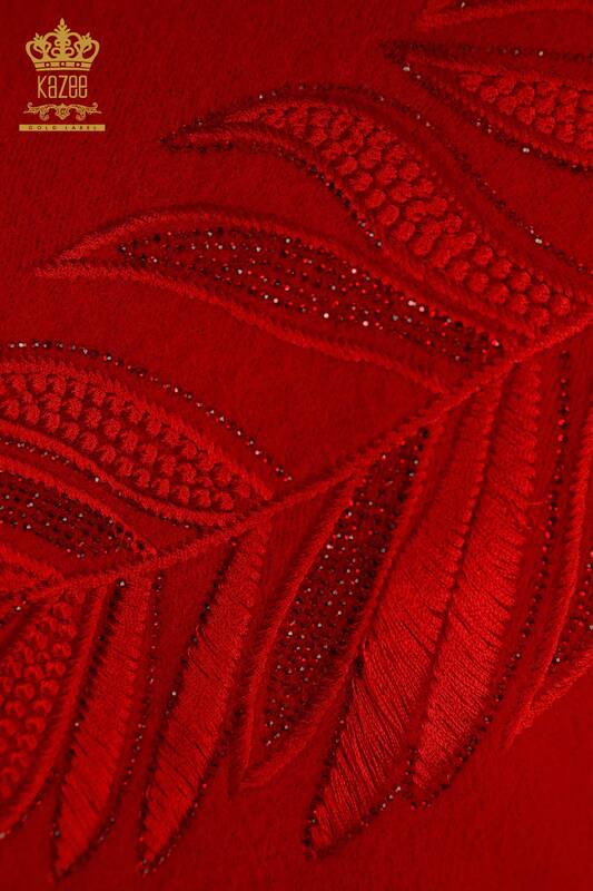Tricotaj cu ridicata pentru femei Pulover cu glugă, frunze de angora brodate, roșu de piatră - 40008 | KAZEE