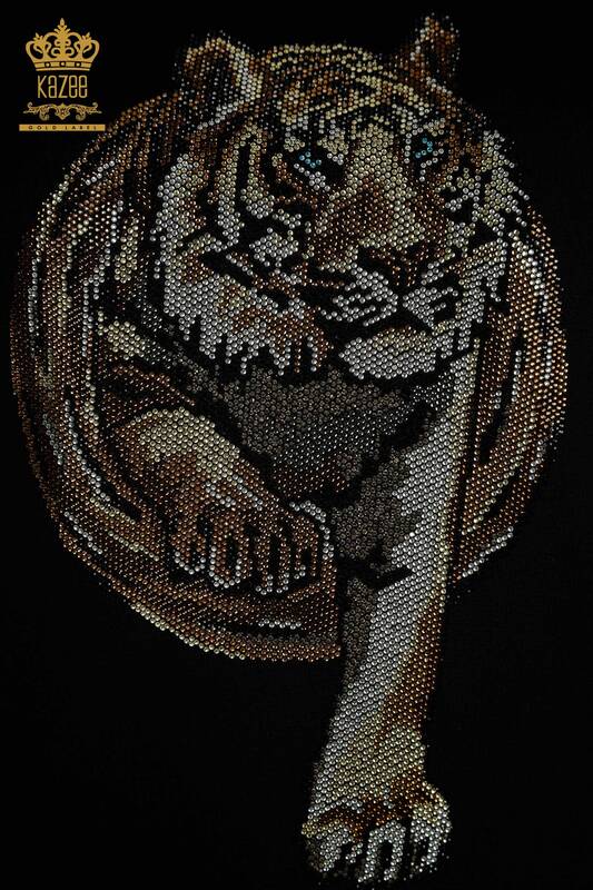 Tricotaj cu ridicata pentru femei Pulover cu piatră leopard brodat cu gât negru - 30747 | KAZEE
