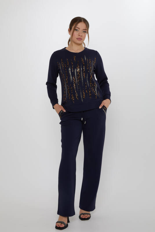 Eşofman Takımı Cep Detaylı Leopar Taş İşlemeli Lacivert - 17886 | KAZEE (3'lü Set M-L-XL)