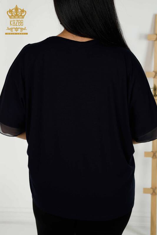 فروش عمده بلوز زنانه طرح گل تول سنگ دوزی شده آبی سرمه ای - 79137 | KAZEE