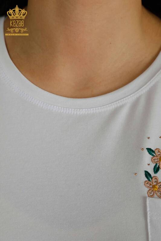 فروش عمده بلوز زنانه جیبی با طرح گل گلدار سنگ دوزی شده سفید - 79477 | KAZEE