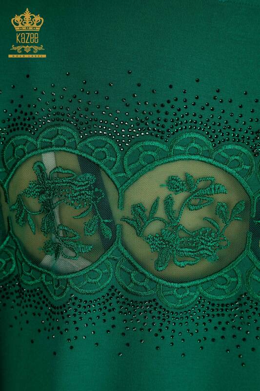فروش عمده بلوز زنانه آستین کوتاه سنگ دوزی شده سبز با جزئیات - 79302 | KAZEE