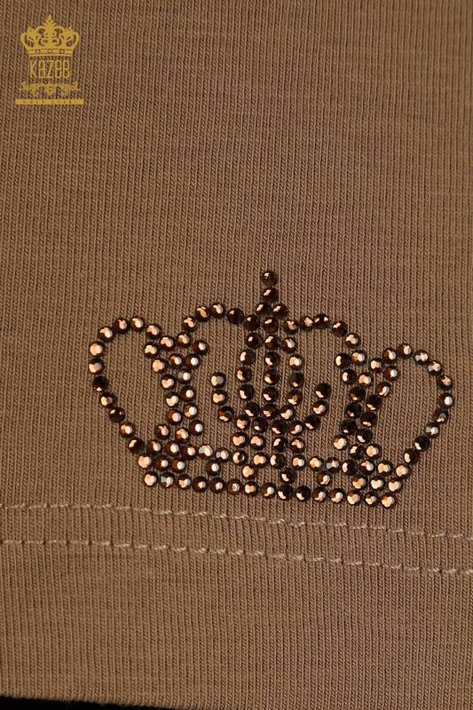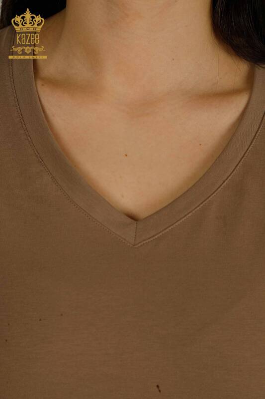 فروش عمده بلوز زنانه آستین کوتاه سنگ دوزی یقه V شکل قهوه ای روشن - 79561 | KAZEE