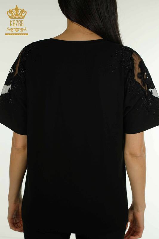 فروش عمده بلوز زنانه شانه توری سنگ دوزی شده با آستین کوتاه مشکی - 79553 | KAZEE