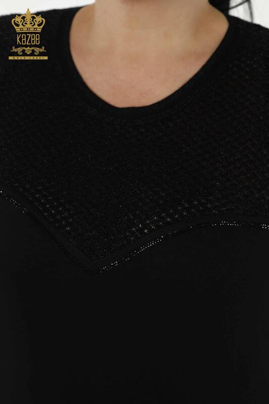 فروش عمده بلوز زنانه سنگ دوزی آستین کوتاه یقه خدمه مشکی - 79235 | KAZEE