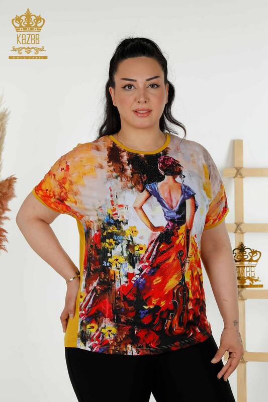 فروش عمده بلوز زنانه آستین کوتاه سنگ دوزی چاپ دیجیتال - 12092 | KAZEE