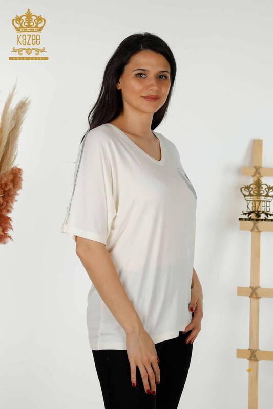 فروش عمده بلوز زنانه سنگ دوزی جیبی اکرو با جزئیات - 77487 | KAZEE
