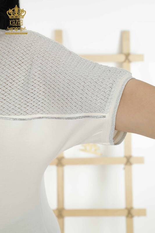 فروش عمده بلوز زنانه سنگ دوزی آستین کوتاه یقه خدمه اکرو - 79235 | KAZEE