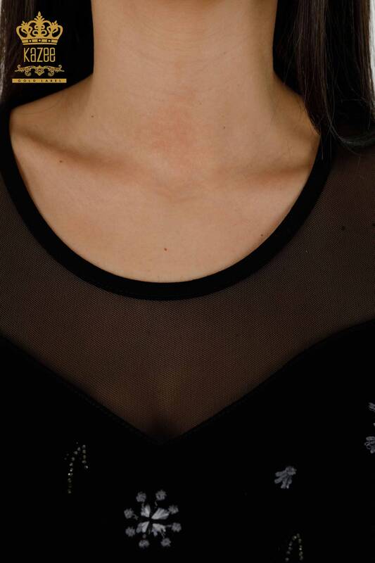 فروش عمده بلوز زنانه تول طرح گل تفصیلی سنگ دوزی مشکی - 79133 | KAZEE