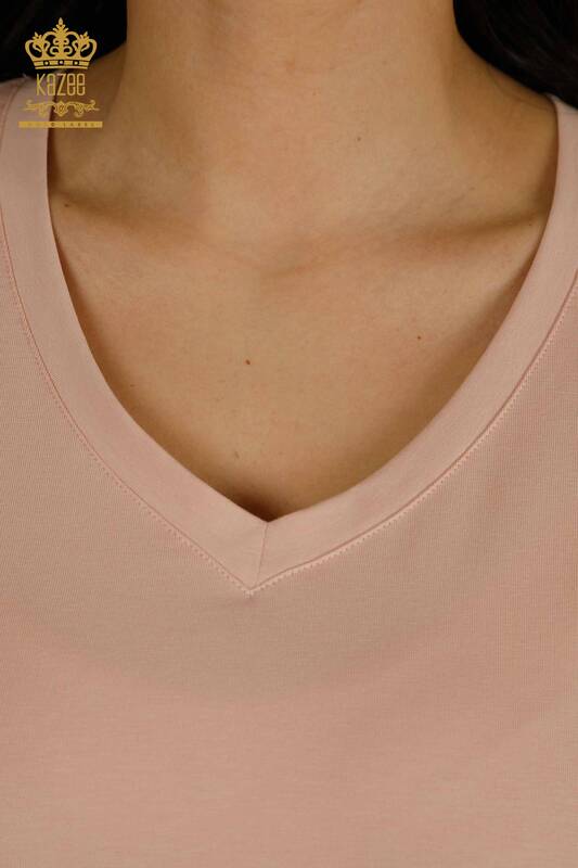 فروش عمده بلوز زنانه یقه وی شکل پودر لوگو دوزی شده - 79564 | KAZEE