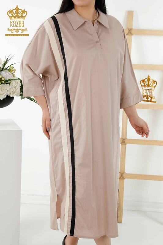 فروش عمده لباس زنانه راه راه رنگی بژ نیمه دکمه ای - 20380 | KAZEE