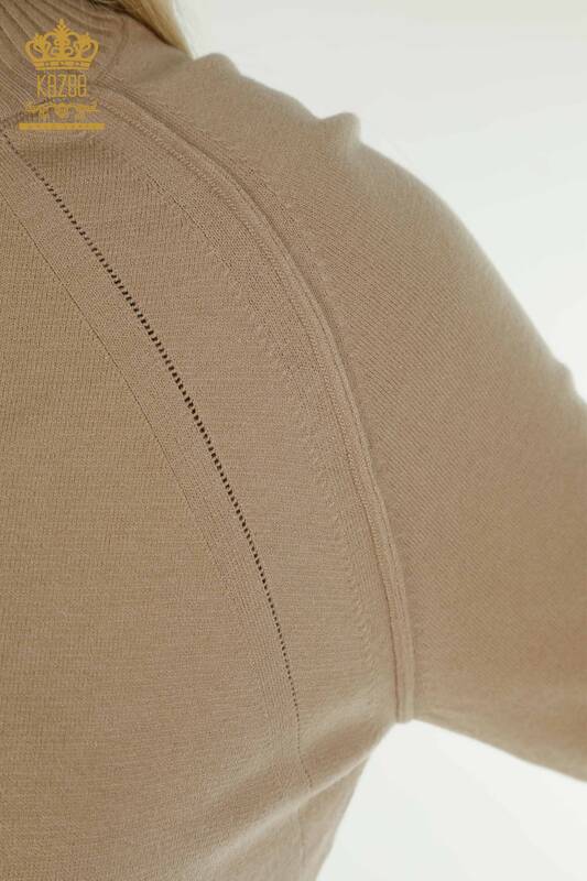 فروش عمده ژاکت بافتنی زنانه بیسیک با جزئیات سوراخ آستین بلند بژ - 30757 | KAZEE