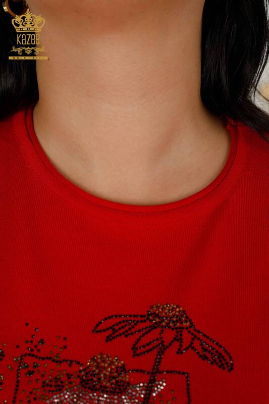 فروش عمده ژاکت بافتنی زنانه سنگ آستین کوتاه طرح دار گلدار قرمز دوزی - 16963 | KAZEE