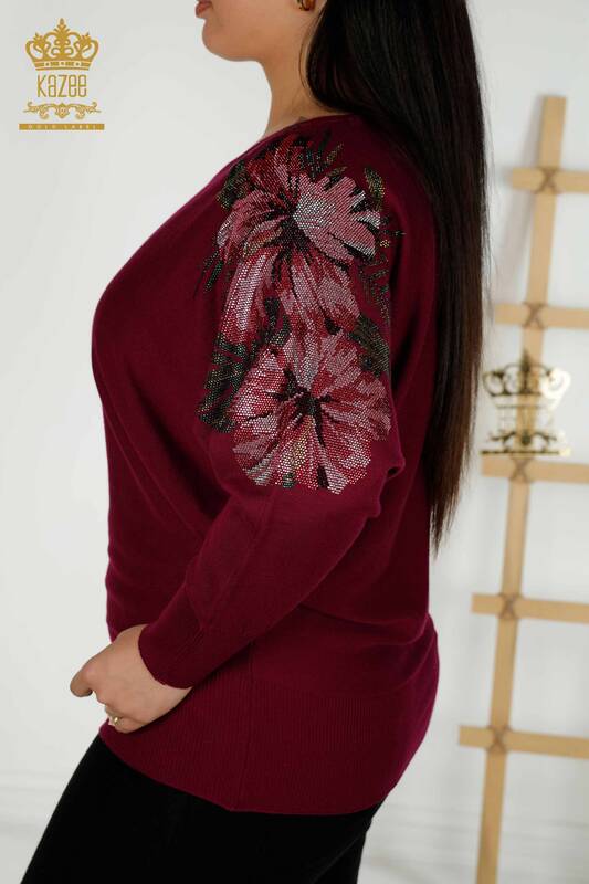 فروش عمده ژاکت بافتنی زنانه سنگ دوزی شده گل سرشانه بنفش - 16133 | KAZEE