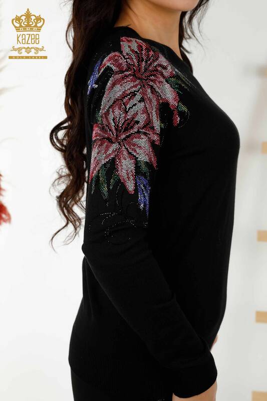 فروش عمده ژاکت بافتنی زنانه ژاکت گلدوزی شده سنگ دوزی مشکی - 30188 | KAZEE
