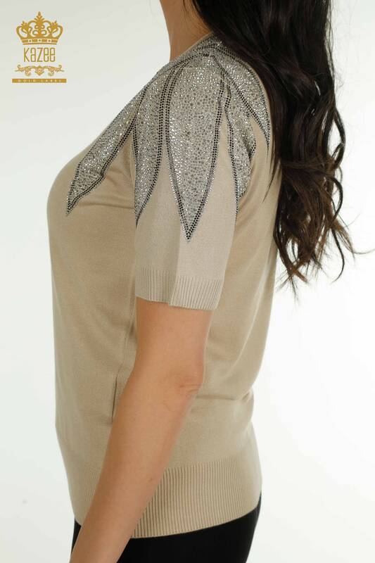 فروش عمده ژاکت بافتنی زنانه سنگ شانه آستین کوتاه دوزی شده بژ روشن - 30792 | KAZEE