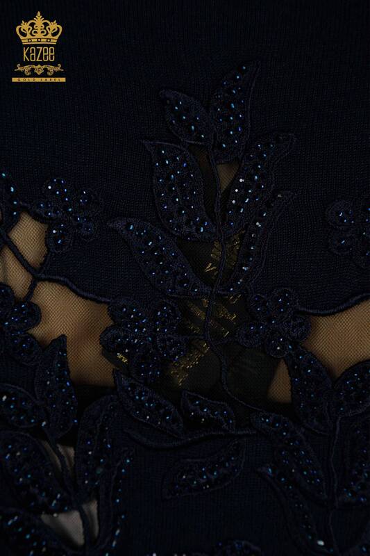 فروش عمده ژاکت بافتنی زنانه - آستین - با جزئیات رز - آبی سرمه ای - 15374 | KAZEE