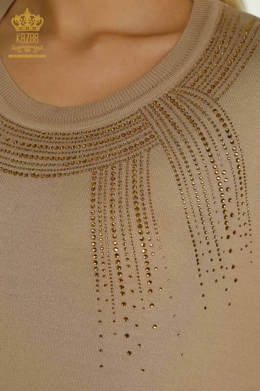 فروش عمده ژاکت بافتنی زنانه سنگ دوزی جیبی با یقه خدمه بژ - 30623 | KAZEE