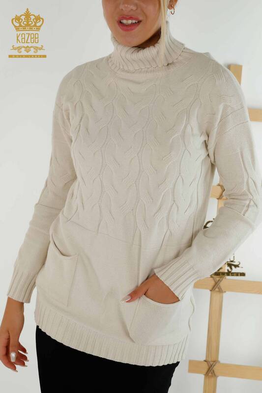 فروش عمده ژاکت بافتنی زنانه یقه یقه دو جیب بژ بافت - 30231 | KAZEE