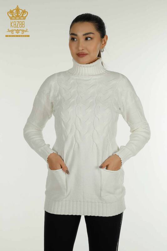 فروش عمده ژاکت بافتنی زنانه یقه اسکی دو جیب اکرو بافت - 30231 | KAZEE