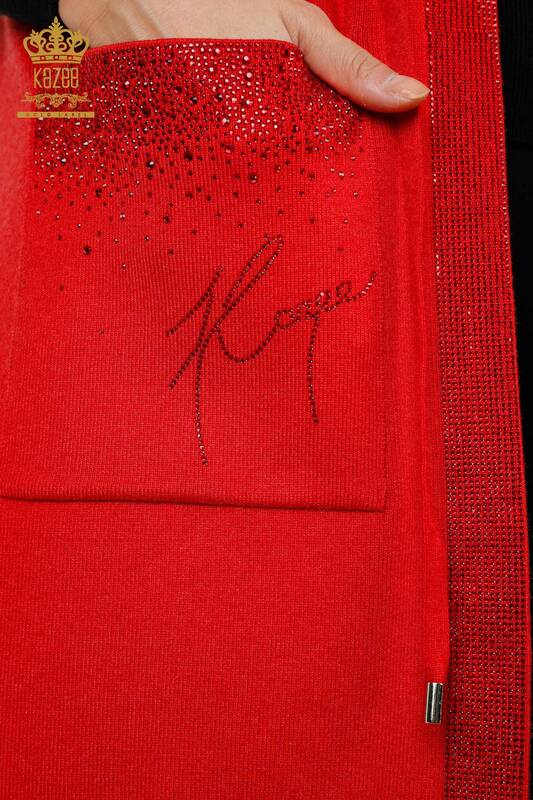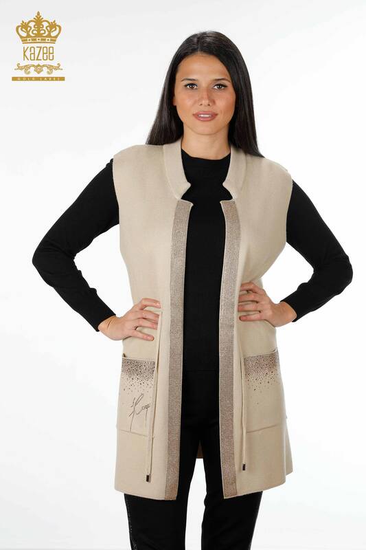 فروش عمده جلیقه بافتنی زنانه نوار دوزی لبه سنگ دوزی جیبی - 16829 | KAZEE