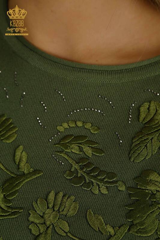 فروش عمده لباس بافتنی زنانه سنگ دوزی گلدار آستین بلند خاکی - 16849 | KAZEE