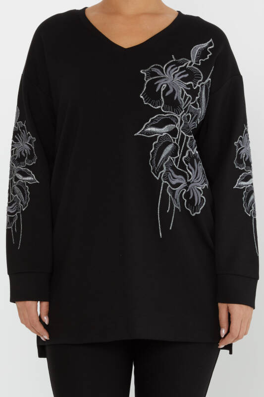 Felpa Ricamata Floreale Manica Lunga Nera - 17781 | KAZEE (Set da 3 L-XL-2XL)
