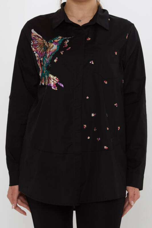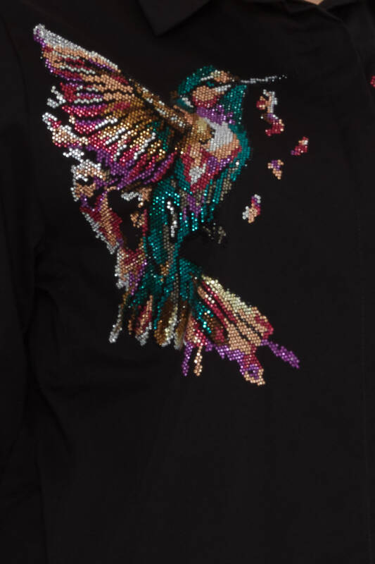Gömlek Kuş Desenli Renkli Taş İşlemeli Siyah - 20518 | KAZEE (3'lü Set 46-48-50)