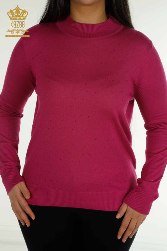 Großhandel Damen-Strickpullover mit Steinstickerei und Stehkragen in Fuchsia - 30677 | KAZEE