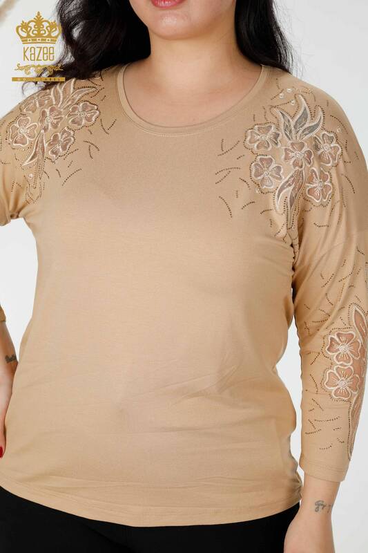 Großhandel Damenbluse Blumenmuster Tüll Detaillierter Stein Bestickt Beige - 77950 | KAZEE