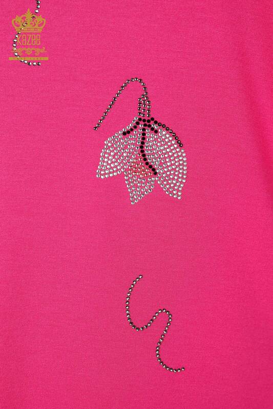 Großhandel Damenbluse Amerikanisches Modell Blumenmuster Stein Bestickt Fuchsia - 78934 | KAZEE