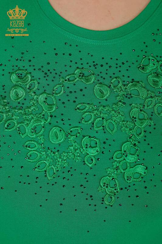 Großhandel Damenbluse Crystal Stone Gesticktes Blumenmuster Grün - 79010 | KAZEE