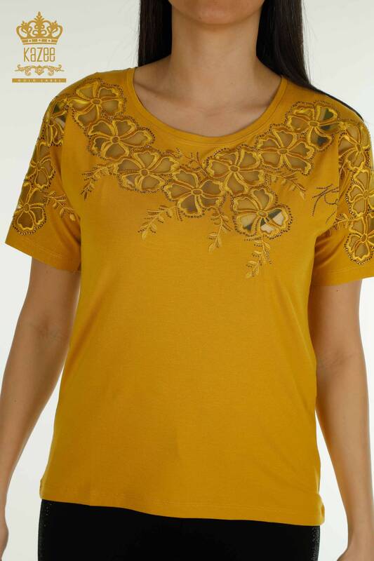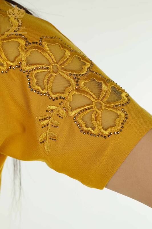 Großhandel Damenbluse Blumenmuster Stein bestickt Tüll detailliert Safran - 79049 | KAZEE