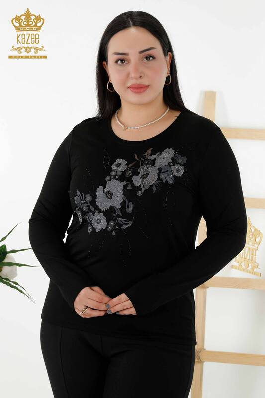 Großhandel Damenbluse Blumenmuster Stein bestickt Schwarz - 79045 | KAZEE